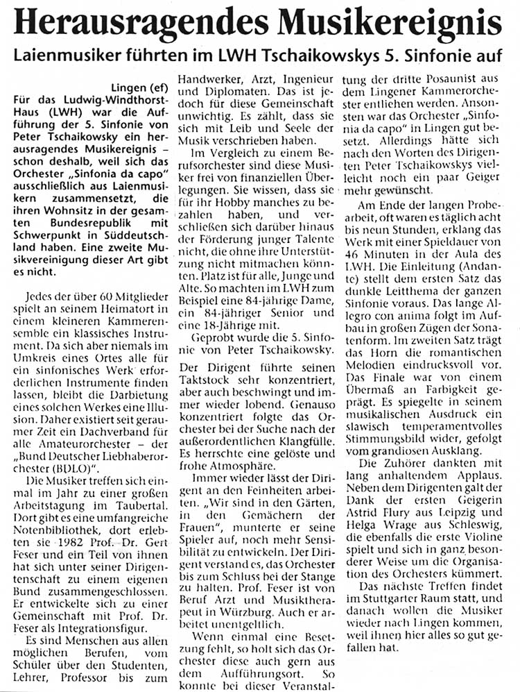 Die Leitung des Orchesters liegt von Anfang an in den bewährten Händen von Gert Feser aus Würzburg. Der Professor für Musiktherapie studierte Medizin und absolvierte außerdem das Kapellmeister-Studium. Mit dieser Doppelausbildung im Hintergrund versteht er das Musizieren als Quelle für Lebensfreude und Form der Gesunderhaltung für Geist und Seele. Mit charmanter Leichtigkeit und einem ständig ermutigenden Lächeln führte er seine Musikerinnen und Musiker sicher über schwierigste Stellen des ausgesprochen anspruchsvollen Werkes. Besonderes Lob steht dem Oboisten Wolfgang Röckl aus Würzburg (hauptberuflich Hautarzt)zu, der in feiner Intonierung und anheimelndem Klang einen fast solistischen Beitrag leistete.Schubert hätte diese 8. Sinfonie durchaus ein Konzert mit obligater Oboe nennen können.